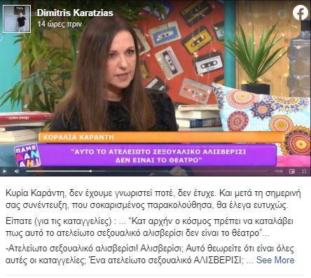 -Επίσης καλό είναι να ξέρετε, επειδή κάποια από αυτά τα κορίτσια τα γνωρίζω προσωπικά, δεν ήταν ήδη ευάλωτα όπως λέτε. Έγιναν ευάλωτα. Εξαιτίας των συμπεριφορών αυτών των “συναδέλφων” μας. Που τόσο σας ενόχλησε που βγήκαν να καταγγείλουν.