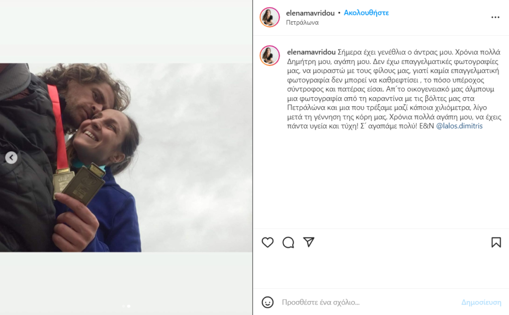 Απ’ το οικογενειακό μας άλμπουμ μια φωτογραφία από τη καραντίνα με τις βόλτες μας στα Πετράλωνα και μια που τρέξαμε μαζί κάποια χιλιόμετρα, λίγο μετά τη γέννηση της κόρη μας. Χρόνια πολλά αγάπη μου, να έχεις πάντα υγεία και τύχη! Σ’ αγαπάμε πολύ! Ε&Ν» έγραψε η Έλενα Μαυρίδου στην ανάρτηση της.