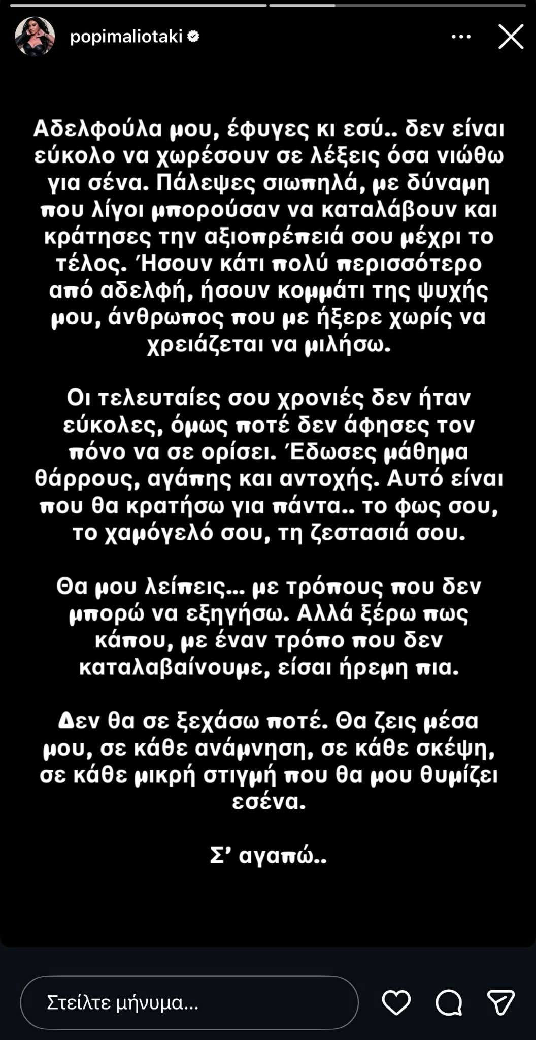 Δε θα σε ξεχάσω ποτέ. Θα ζεις μέσα μου, σε κάθε ανάμνηση, σε κάθε σκέψη, σε κάθε μικρή στιγμή που θα θυμίζει εσένα. Σ’ αγαπώ», έγραψε η Πόπη Μαλλιωτάκη για τον θάνατο της αδελφής της.