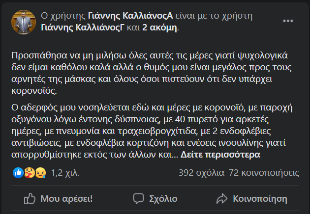 Δύσκολες ώρες διανύει ο Γιάννης Καλλιάνος, ο οποίος με ανάρτησή του στο Facebook, μίλησε για τον αδελφό του που νοσηλεύεται με κορονοϊό εδώ και ημέρες σε πολύ σοβαρή κατάσταση.