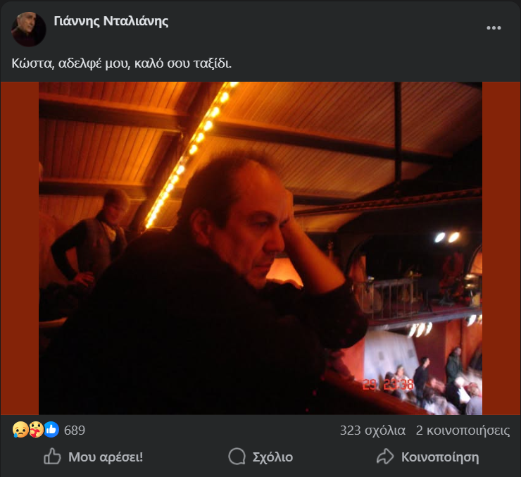 Μάλιστα, ο ηθοποιός γνωστοποίησε το δυσάρεστο γεγονός μέσα από την προσωπική του σελίδα στο facebook, αναρτώντας μία φωτογραφία του και γράφοντας «Κώστα, αδελφέ μου, καλό ταξίδι».
