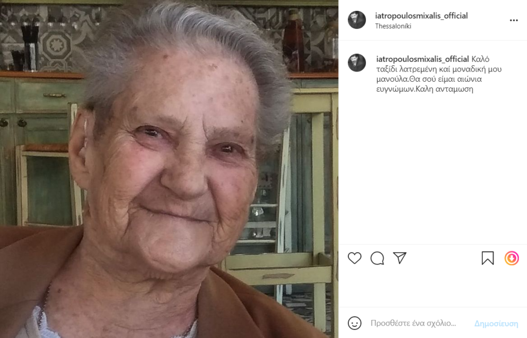 “Καλό ταξίδι λατρεμένη και μοναδική μου μανούλα. Θα σού είμαι αιώνια ευγνώμων. Καλή αντάμωση”, έγραψε ο Μιχάλης Ιατρόπουλος στη λεζάντα της φωτογραφίας του.
