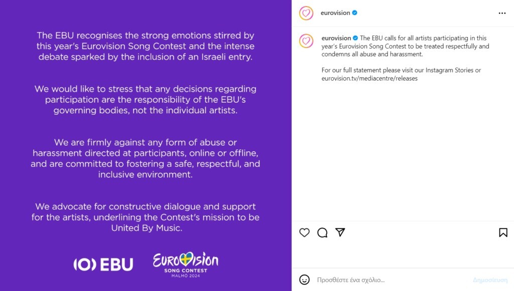 «Η EBU αναγνωρίζει τα έντονα συναισθήματα που προκαλούνται στον φετινό διαγωνισμό της Eurovision και την ισχυρή αντιπαράθεση που έχει προκαλέσει η συμμετοχή του Ισραήλ. Θα θέλαμε να ξεκαθαρίσουμε πως οποιαδήποτε απόφαση λαμβάνεται για τη συμμετοχή των χωρών στη διοργάνωση αφορά τους ιθύνοντες της EBU και όχι τους ίδιους τους καλλιτέχνες.