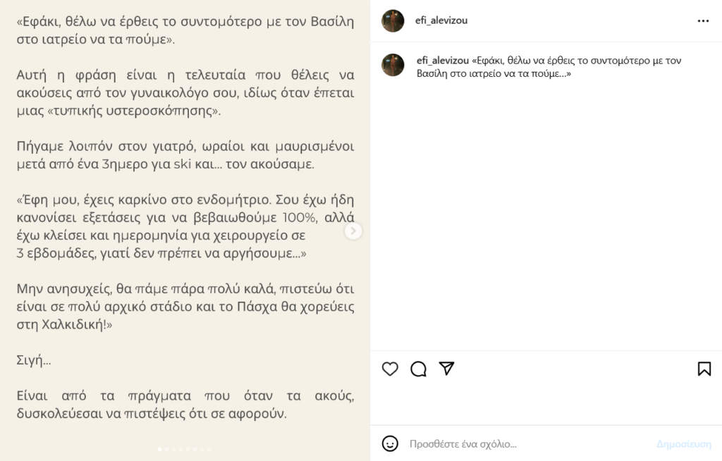 Μέσα από μία ανάρτηση στον λογαριασμό της στο instagram, η Έφη Αλεβίζου αποκάλυψε την περιπέτεια που πέρασε πριν ένα χρόνο με την υγεία της και χρειάστηκε να υποβληθεί σε ριζική υστερεκτομή.