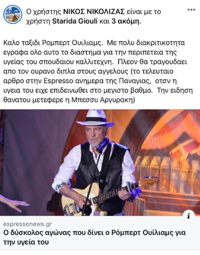 Την δυσάρεστη είδηση την έκανε γνωστή ο δημοσιογράφος Νίκος Νικόλιζας μέσα από το προσωπικό του λογαριασμό στο facebook όπου έγραψε ένα αποχαιρετιστήριο μήνυμα για τον καλλιτέχνη!