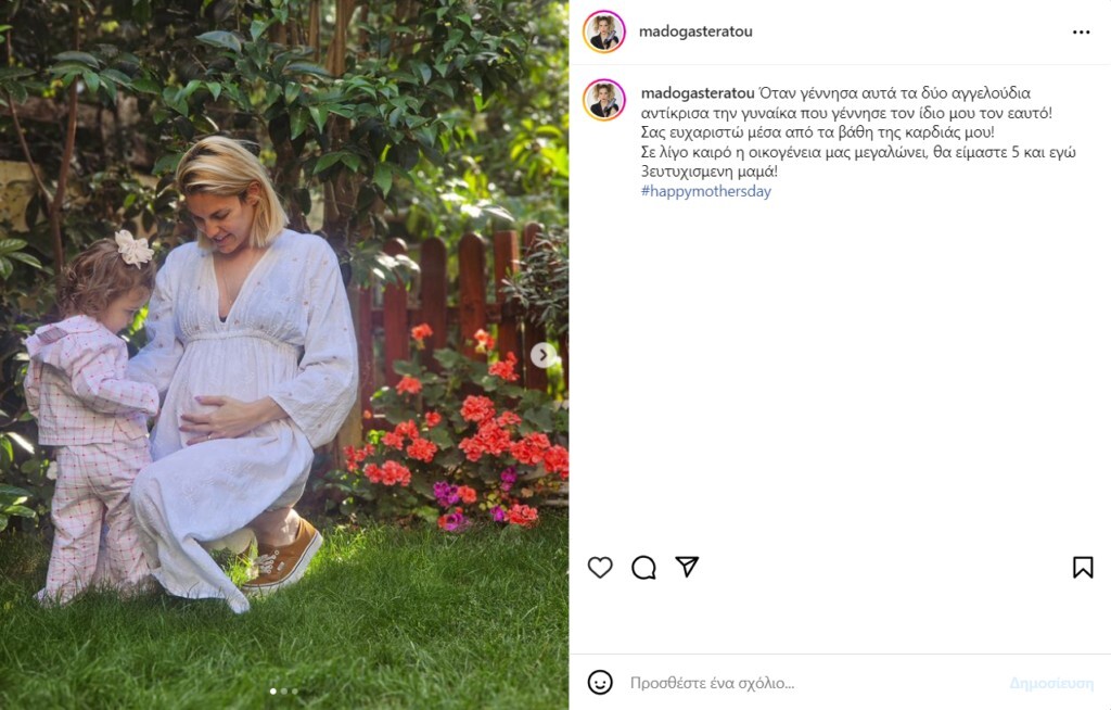 «Όταν γέννησα αυτά τα δύο αγγελούδια αντίκρισα την γυναίκα που γέννησε τον ίδιο μου τον εαυτό! Σας ευχαριστώ μέσα από τα βάθη της καρδιάς μου! Σε λίγο καιρό η οικογένεια μας μεγαλώνει, θα είμαστε 5 και εγώ 3ευτυχισμενη μαμά!», έγραψε η Μαντώ Γαστεράτου στην ανάρτησή της, ενώ την συνόδευσε με δύο στιγμιότυπα μαζί με την κόρη της και τον γιο της.