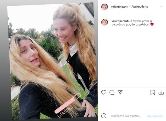 Το ευχάριστο γεγονός γνωστοποίησε η ίδια, αφού ανήρτησε στον προσωπικό της λογαριασμό στο Instagram μια φωτογραφία στην οποία ποζάρει με φουσκωμένη κοιλίτσα στην αγκαλιά της δίδυμης αδερφής της, Αγάθης και έγραψε: «Σε λίγους μήνες η οικογένεια μας θα μεγαλώσει».