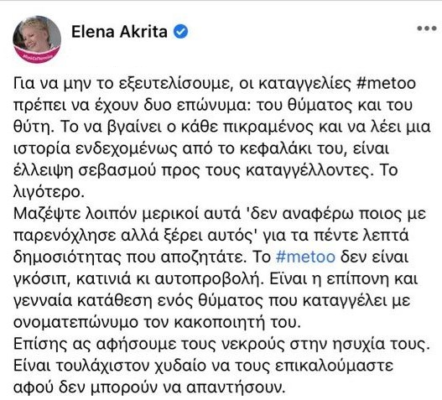 Μαζέψτε λοιπόν μερικοί αυτά ‘δεν αναφέρω ποιος με παρενόχλησε αλλά ξέρει αυτός’ για τα πέντε λεπτά δημοσιότητας που αποζητάτε. Το #metoo δεν είναι γκόσιπ, κατινιά κι αυτοπροβολή. Είναι η επίπονη και γενναία κατάθεση ενός θύματος που καταγγέλλει με ονοματεπώνυμο τον κακοποιητή του. Επίσης ας αφήσουμε τους νεκρούς στην ησυχία τους. Είναι τουλάχιστον χυδαίο να τους επικαλούμαστε αφού δεν μπορούν να απαντήσουν», έγραψε η Έλενα Ακρίτα.