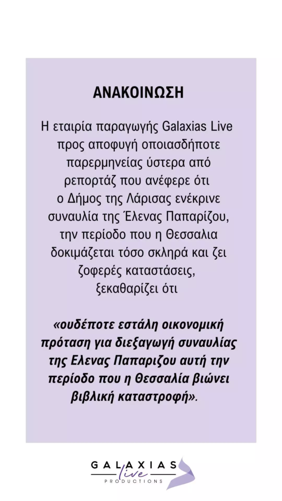 «Η εταιρία παραγωγής Galaxias Live προς αποφυγή οποιαδήποτε παρερμηνείας ύστερα από ρεπορτάζ που ανέφερε ότι ο Δήμος Λάρισας ενέκρινε συναυλία της Έλενας Παπαρίζου την περίοδο που η Θεσσαλία δοκιμάζεται τόσο σκληρά και ζει ζοφερές καταστάσεις, ξεκαθαρίζει ότι ουδέποτε εστάλη πρόταση για διεξαγωγή συναυλίας της Έλενας Παπαρίζου αυτή την περίοδο που η Θεσσαλία βιώνει βιβλική καταστροφή».