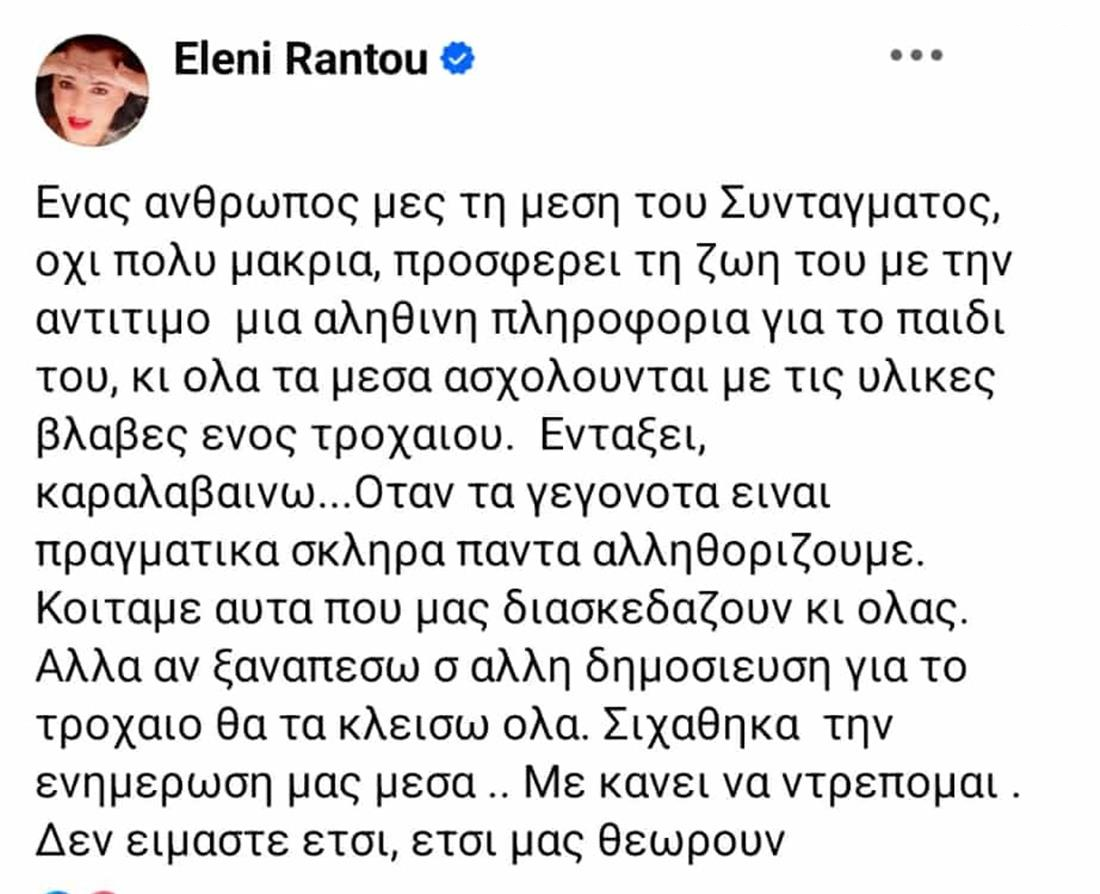 Κοιτάμε αυτά που μας διασκεδάζουν κιόλας. Αλλά αν ξαναπέσω σε άλλη δημοσίευση για το τροχαίο θα τα κλείσω όλα. Σιχάθηκα την ενημέρωσή μας… Με κάνει να ντρέπομαι. Δεν είμαστε έτσι, έτσι μας θεωρούν» έγραψε η Ελένη Ράντου στον προσωπικό της λογαριασμό.