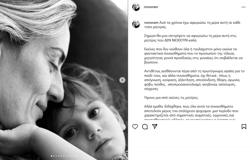 «Ανά τα χρόνια έχω αφιερώσει τη μέρα αυτή σε κάθε τύπο μητέρας. Σήμερα θα μου επιτρέψετε να αφιερώσω τη μέρα αυτή στις μητέρες που ΔΕΝ ΝΙΩΘΟΥΝ καλά. Εκείνες που δεν νιώθουν όλα ή τουλάχιστον μόνο εκείνα τα φανταστικά συναισθήματα που το προσωπείο της τέλειας μητρότητας γεννά προσδοκίες στις γυναίκες ότι επιβάλλεται να βιώσουν.
