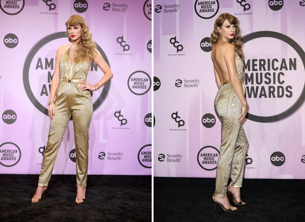 Συγκεκριμένα η Swift επέλεξε μία ολόχρυση ολόσωμη sequin jumpsuit φόρμα από το σχεδιαστικό δίδυμο των The Blonds, που είχε open back σχέδιο και 70s mood.