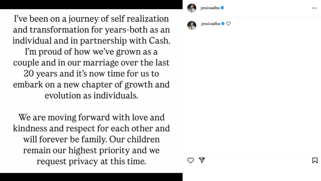 Προχωράμε μπροστά με αγάπη, καλοσύνη και σεβασμό ο ένας για τον άλλον και θα είμαστε για πάντα οικογένεια. Τα παιδιά μας παραμένουν η απόλυτη προτεραιότητά μας και ζητούμε διακριτικότητα σε αυτή τη φάση της ζωής μας», ανέφερε η Τζέσικα Άλμπα στη λεζάντα της.