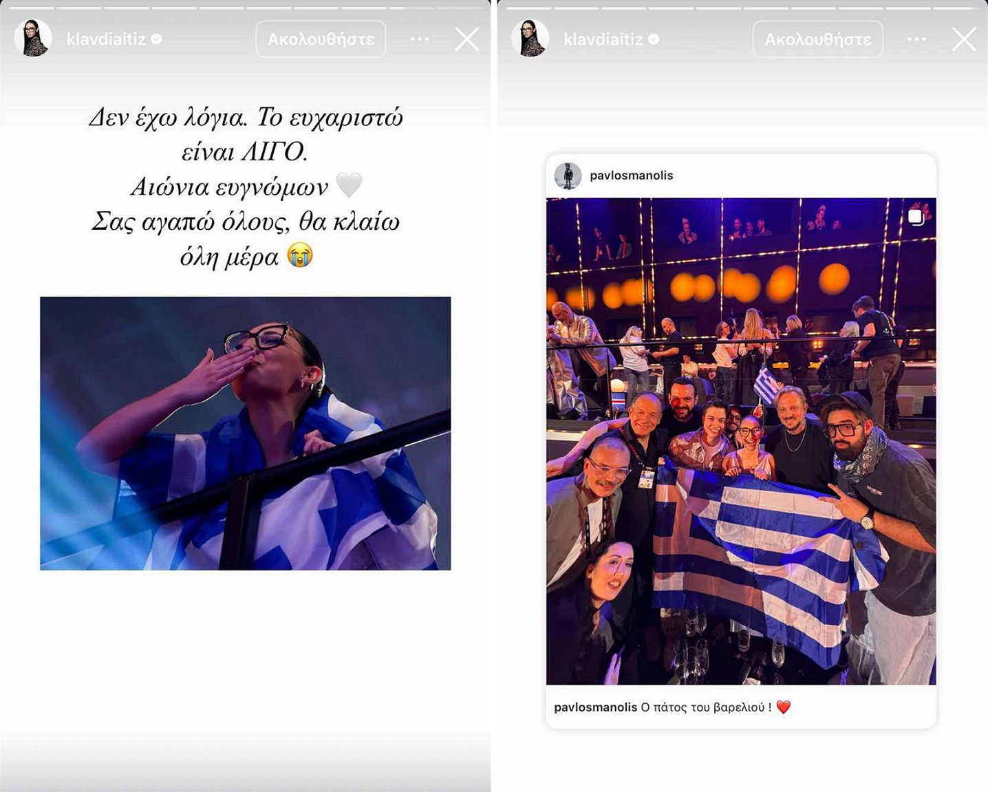 «Δεν έχω λόγια. Το ευχαριστώ είναι ΛΙΓΟ. Αιώνια ευγνώμων. Σας αγαπώ όλους, θα κλαίω όλη μέρα» γράφει στη μια, ενώ σε άλλη ποζάρει με ολόκληρη την ελληνική αποστολή και στη λεζάντα, γράφει: «Ο πάτος του βαρελιού», θέλοντας να απαντήσει, στα επικριτικά σχόλια που ακούστηκαν αρχικά για την συμμετοχή της.
