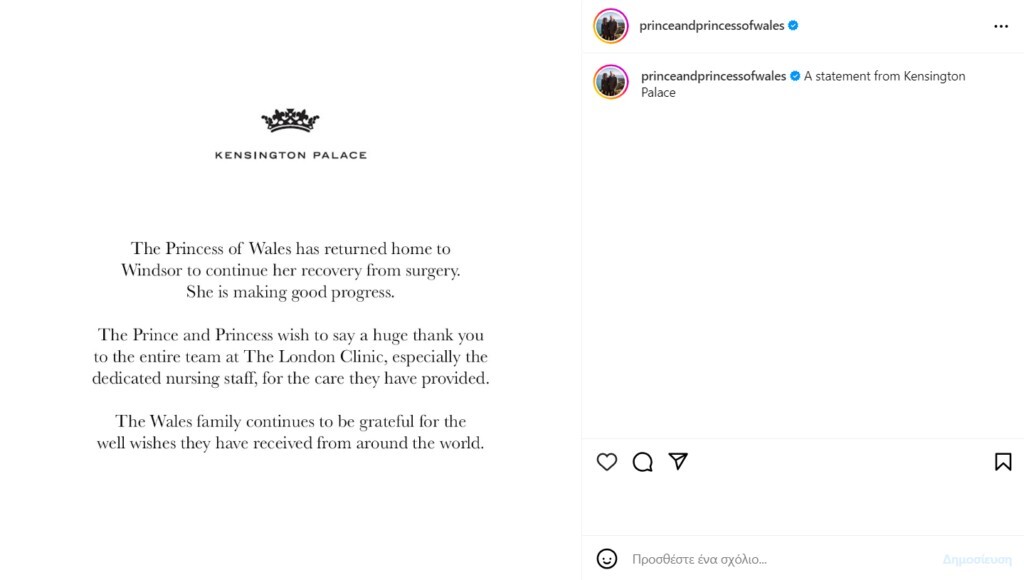 «Η πριγκίπισσα της Ουαλίας επέστρεψε στο σπίτι της στο Windsor για να συνεχίσει την ανάρρωσή της από το χειρουργείο. Έχει καλή πρόοδο.