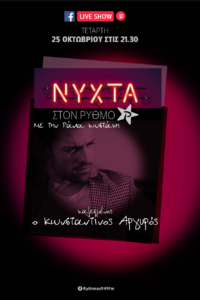 Μείνετε συντονισμένοι στα ραδιόφωνά σας αλλά και online στην FB σελίδα του Ρυθμός 949 την Τετάρτη 25 Οκτωβρίου στις 21.30 ακριβώς, για να δείτε live τον Κωνσταντίνο Αργυρό.