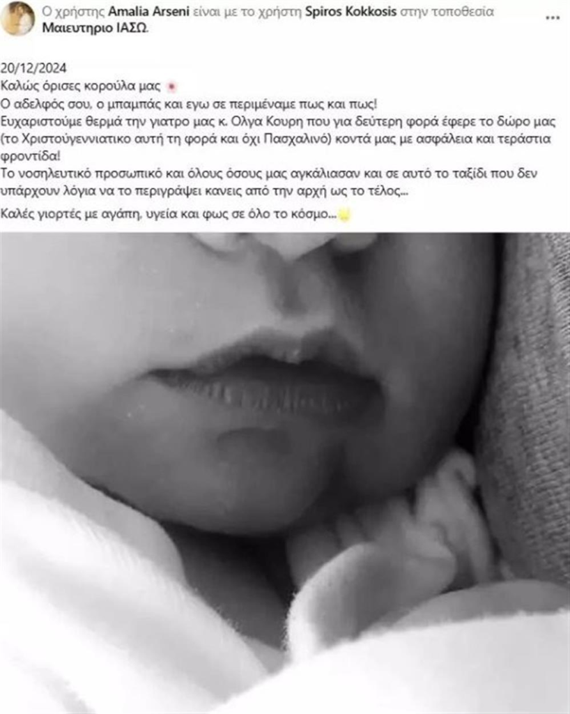 «20/12/2024, Καλώς όρισες κορούλα μας. Ο αδελφός σου, ο μπαμπάς και εγώ σε περιμέναμε πως και πως! Ευχαριστούμε θερμά την γιατρό μας κ. Όλγα Κουρή που για δεύτερη φορά έφερε το δώρο μας (το Χριστουγεννιάτικο αυτή τη φορά και όχι Πασχαλινό) κοντά μας με ασφάλεια και τεράστια φροντίδα!
