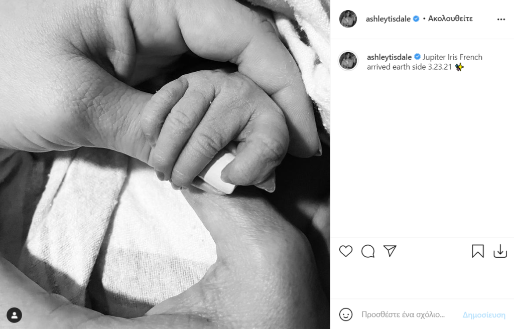 Μάλιστα, Ashley Tisdale που είναι ιδιαίτερα ενεργή στα social media, πόσταρε μια φωτογραφία στην οποία απεικονίζεται η ίδια να κρατάει το χεράκι τις νεογέννητης κορούλας της και αποκαλύπτει πως γέννησε την Τρίτη 23 Μαρτίου.