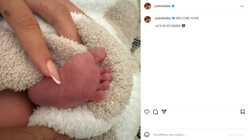 Μάλιστα, την ευχάριστη είδηση γνωστοποίησε ο ίδιος ο Justin ο οποίος δημοσίευσε στον προσωπικό του λογαριασμό στο Instagram μία φωτογραφία με τα νεογέννητα πατουσάκια του γιου του.