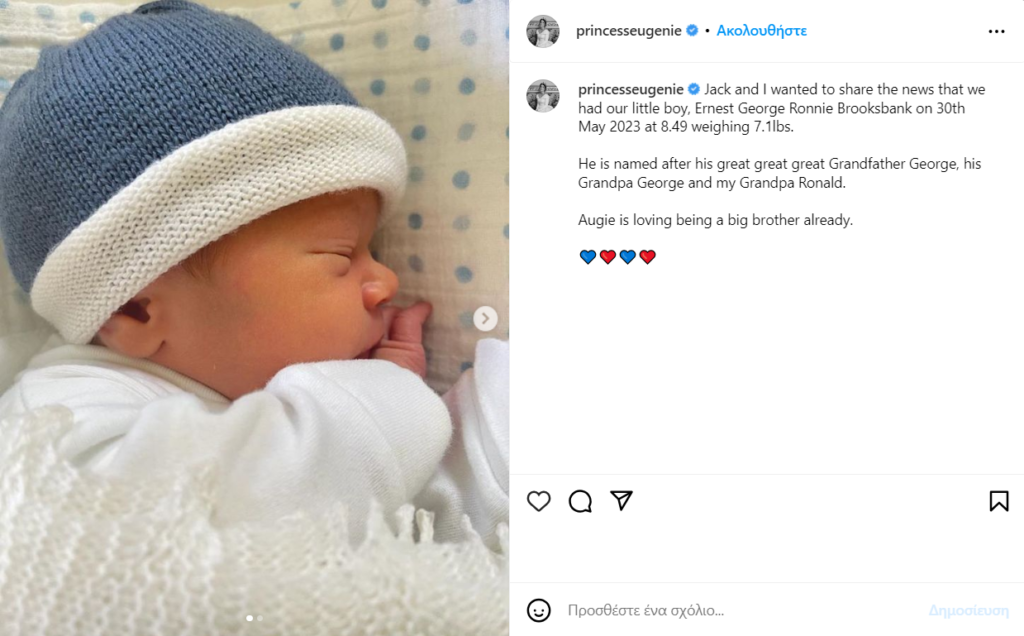 «Ο Τζακ και εγώ θέλαμε να μοιραστούμε τα νέα ότι αποκτήσαμε το μικρό μας αγόρι, τον Έρνεστ Τζορτζ Ρόνι Μπρούκσμπανκ στις 30 Μαΐου 2023 στις 8:49 και ζύγιζε 3,203 κιλά. Πήρε το όνομά του από τον μεγάλο του παππού Γιώργο, τον παππού του Γιώργο και τον παππού μου Ρόναλντ. O Augie λατρεύει ήδη το να είναι ο μεγάλος αδερφός», έγραψε η πριγκίπισσα Ευγενία στο post της.