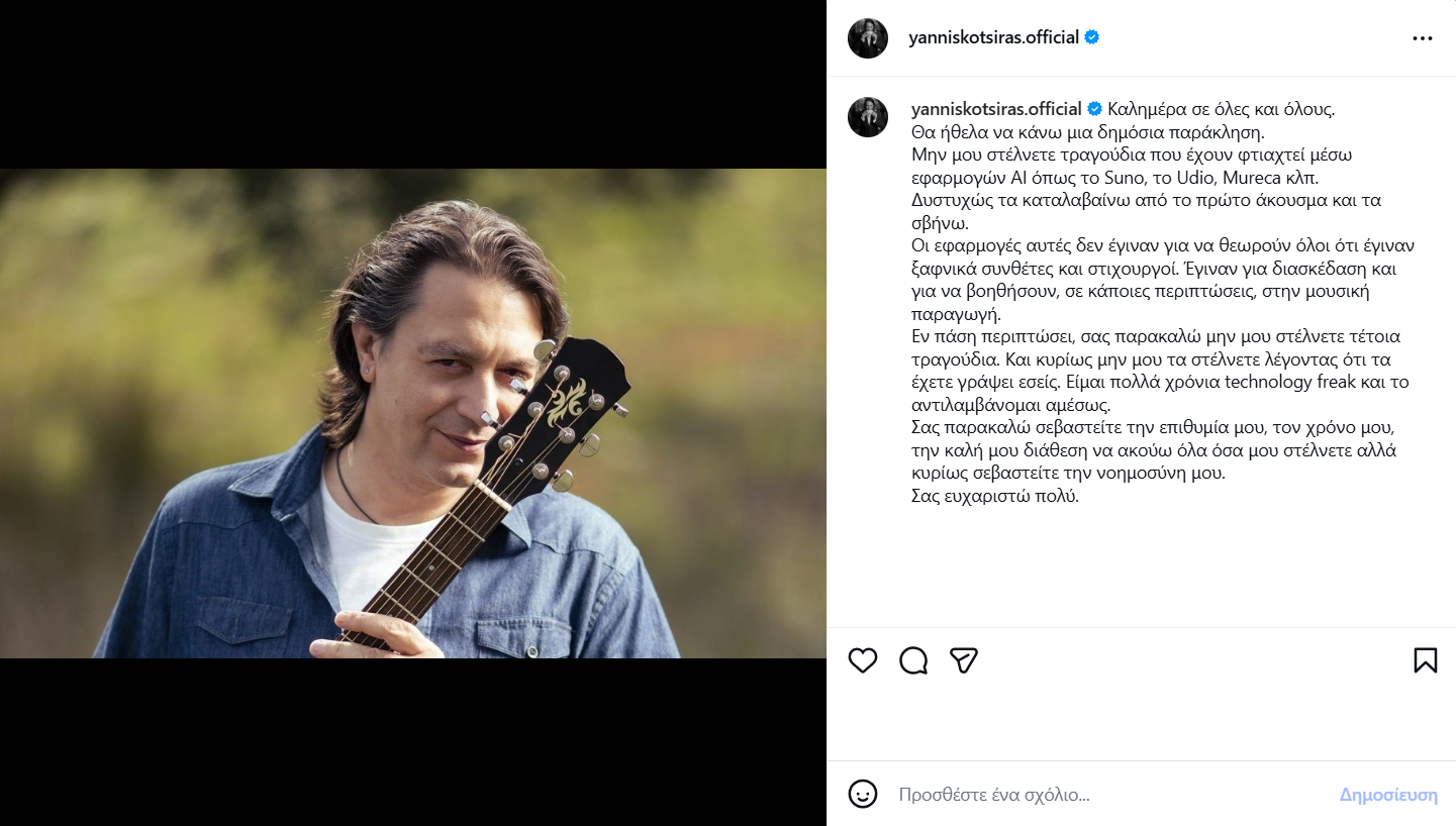 «Καλημέρα σε όλες και όλους. Θα ήθελα να κάνω μια δημόσια παράκληση. Μην μου στέλνετε τραγούδια που έχουν φτιαχτεί μέσω εφαρμογών AI όπως το Suno, το Udio, Mureca κλπ. Δυστυχώς τα καταλαβαίνω από το πρώτο άκουσμα και τα σβήνω. Οι εφαρμογές αυτές δεν έγιναν για να θεωρούν όλοι ότι έγιναν ξαφνικά συνθέτες και στιχουργοί. Έγιναν για διασκέδαση και για να βοηθήσουν, σε κάποιες περιπτώσεις, στην μουσική παραγωγή.