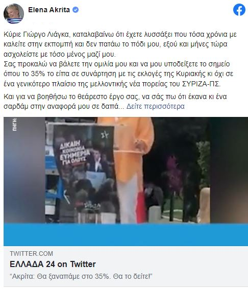 Και για να βοηθήσω το θεάρεστο έργο σας, να σας πω ότι έκανα κι ένα σαρδάμ στην αναφορά μου σε δαπάνες εκατομμυρίων/δισεκατομμυρίων, ψάξτε το να το βάλετε κι αυτό. Οι κατάμεστες πλατείες όπως η χτεσινή ενοχλούν, κύριε Λιάγκα. Έτσι δεν είναι; Να σας βάζω λινκ κι από ομάδα αλήθειας που μιλούν την ίδια γλώσσα με σας για να συνεννοηθούμε. Έντιτ. Κοίτα που ασχολήθηκα και με τον Λιάγκα» έγραψε η Έλενα Ακρίτα.