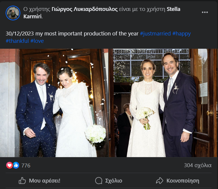 Ενώ την αποκάλυψη του γάμου έκανε ο Γιώργος Λυκιαρδόπουλος δημοσιεύοντας μερικές φωτογραφίες στον προσωπικό του λογαριασμό στο facebook.