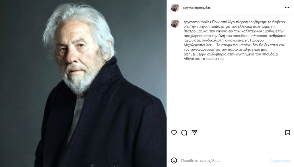 Μάθαμε την αποχώρηση από την ζωή του σπουδαίου ηθοποιού, ανθρώπου, αγωνιστή, συνδικαλιστή, οικογενειάρχη, Γιώργου Μιχαλακόπουλου… Το στίγμα που αφήνει δεν θα ξεχαστεί και τον ευγνωμονούμε για την παρακαταθήκη που μας αφήνει. Θερμά συλληπητήρια στην αγαπημένη του σπουδαία Αθηνά και τα παιδιά του», γράφει ο πρόεδρος του ΣΕΗ στην ανάρτηση του.