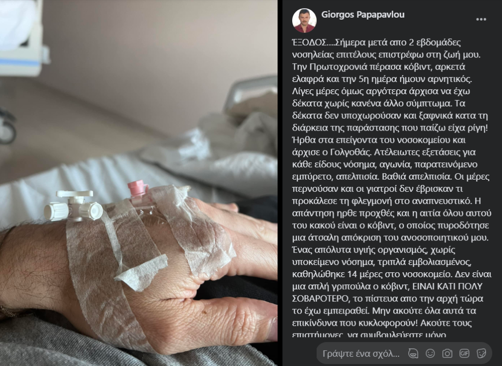 Ένας απόλυτα υγιής οργανισμός, χωρίς υποκείμενο νόσημα, τριπλά εμβολιασμένος, καθηλώθηκε 14 μέρες στο νοσοκομείο. Δεν είναι μια απλή γριπούλα ο covid, ΕΙΝΑΙ ΚΑΤΙ ΠΟΛΥ ΣΟΒΑΡΟΤΕΡΟ, το πίστευα από την αρχή τώρα το έχω εμπειραθεί. Μην ακούτε όλα αυτά τα επικίνδυνα που κυκλοφορούν! Ακούτε τους επιστήμονες, να συμβουλεύεστε μόνο (σοβαρούς) γιατρούς», έγραψε ο Γιώργος Παπαπαύλου στην ανάρτηση του.