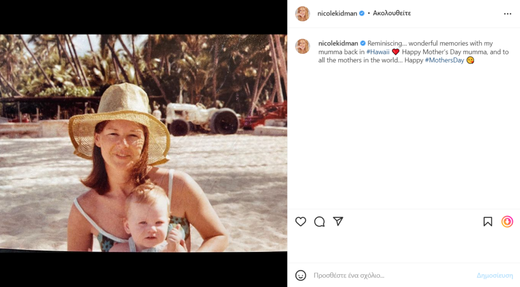 Μάλιστα, το ίδιο έκανε και η Nicole Kidman, η οποία με αφορμή αυτή την ιδιαίτερη ημέρα δημοσίευσε στον προσωπικό της λογαριασμό στο Instagram μια φωτογραφία της μητέρας της.