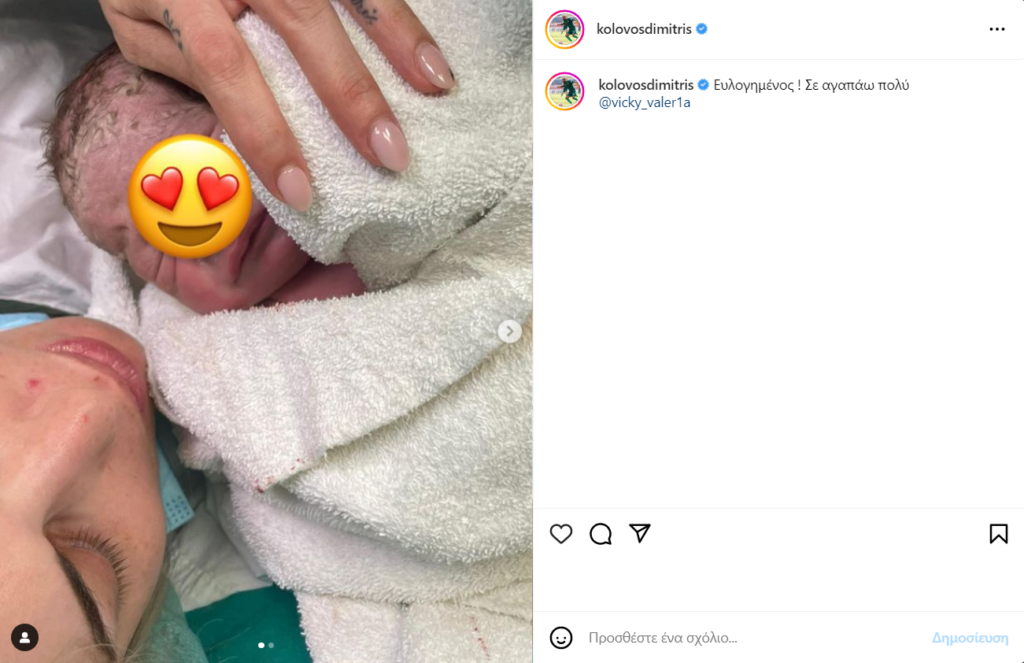 «Ευλογημένος ! Σε αγαπάω πολύ», έγραψε ο Δημήτρης Κολοβός στη λεζάντα των φωτογραφιών τους μέσα από το μαιευτήριο.