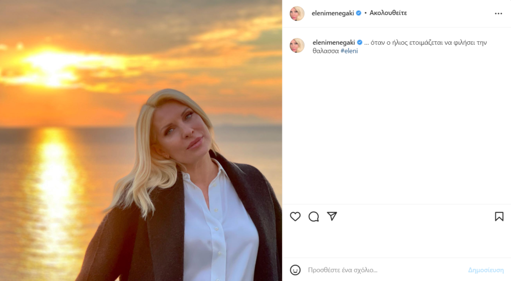 Λίγες ώρες αργότερα η παρουσιάστρια κοινοποίησε μια ακόμα φωτογραφία με θέα το απέραντο γαλάζιο και το ηλιοβασίλεμα και έγραψε στη λεζάντα: «όταν ο ήλιος ετοιμάζεται να φιλήσει την θάλασσα».