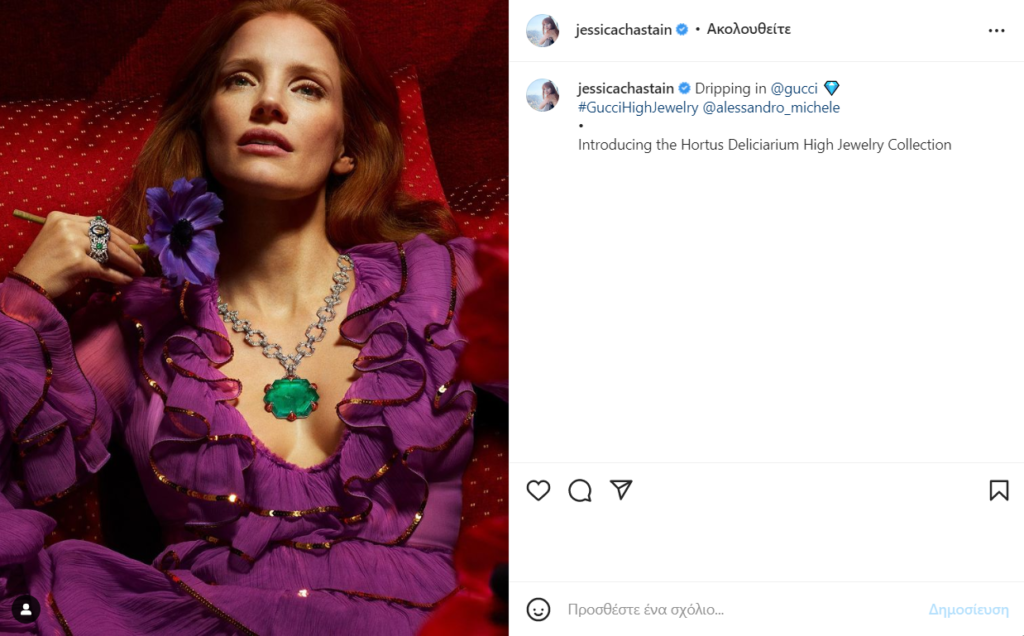 Να πούμε πως η Chastain στις τελευταίες δημόσιες εμφανίσεις της είχε φορέσει Gucci κομμάτια και τώρα αυτή η συνεργασία έρχεται να υπογραμμίσει την σχέση της με τον οίκο.