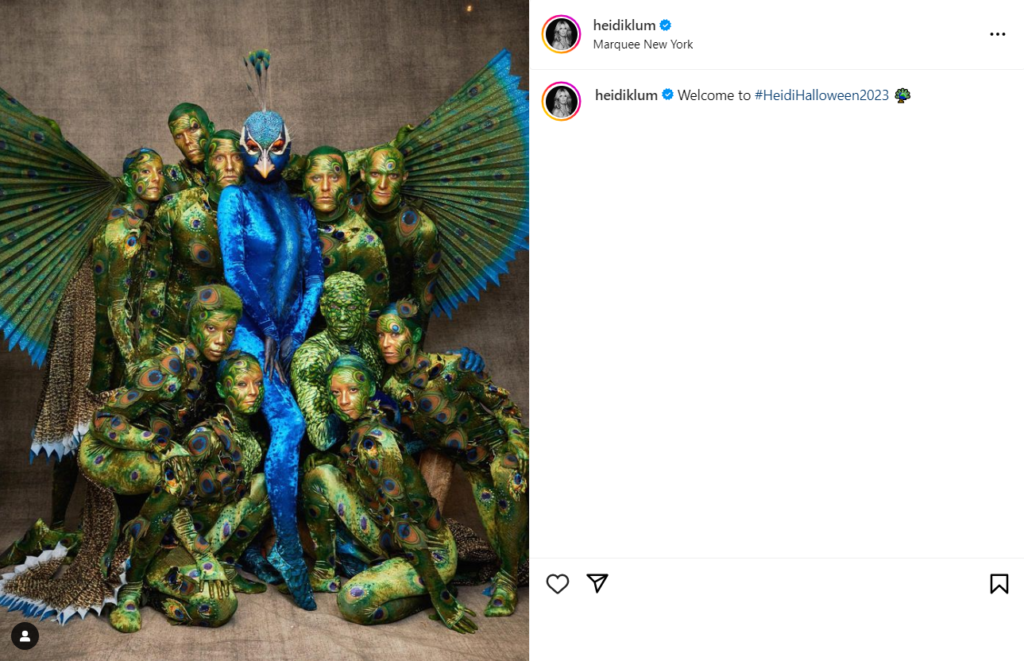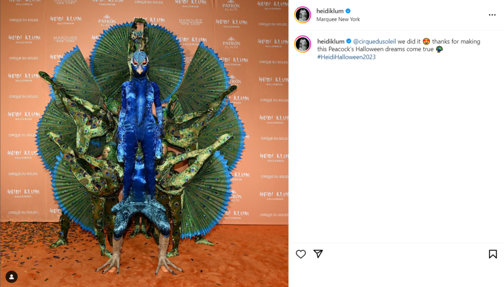 Αυτή τη φορά η Heidi Klum έφτασε στο πάρτι της, μεταμφιεσμένη ως ένα… γιγαντιαίο παγώνι, που συνοδευόταν από ένα σμήνος φτερών.
