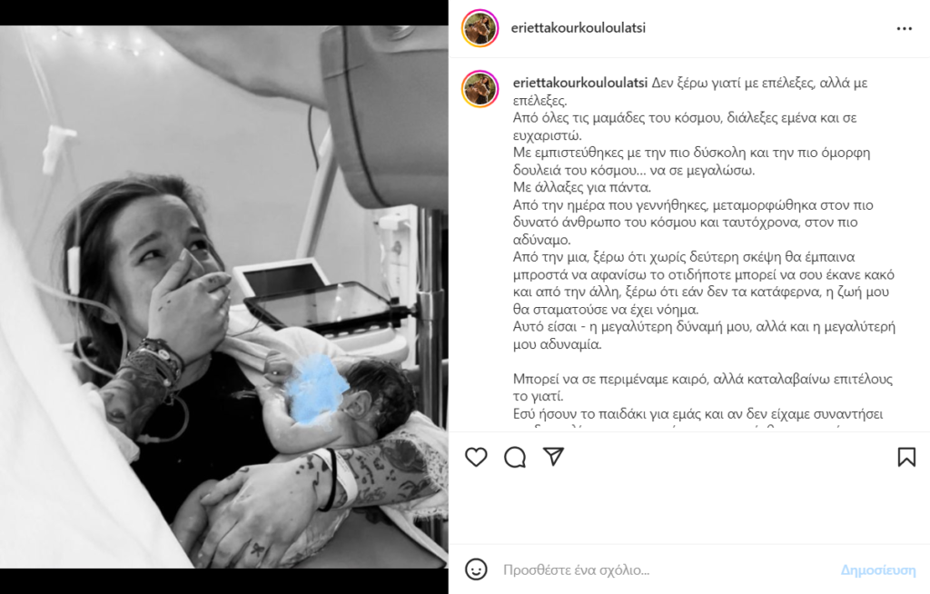 Χρόνια Πολλά ζωή μου και σε ευχαριστώ που μου έκανες την τιμή να με επιλέξεις για μαμά σου. Ελπίζω να σταθώ αντάξια του ιερού ρόλου που μου έχει ανατεθεί» έγραψε η Εριέττα Κούρκουλου Λάτση στην ανάρτησή της, όπου τη βλέπουμε να κρατάει τον γιο της, μέσα στο μαιευτήριο.