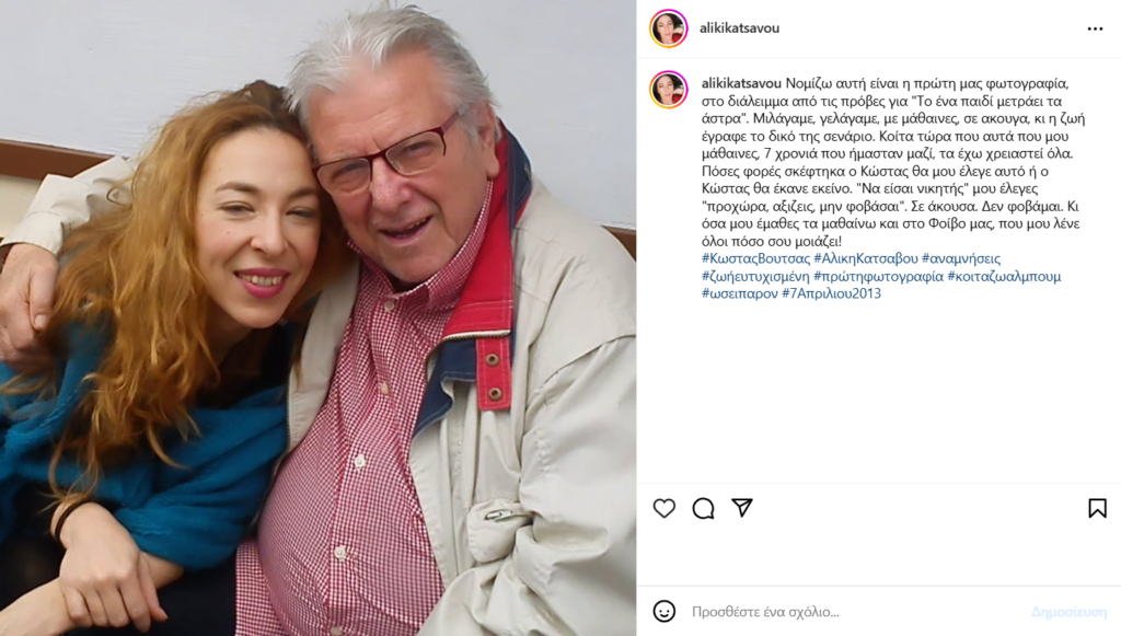 «Νομίζω αυτή είναι η πρώτη μας φωτογραφία, στο διάλειμμα από τις πρόβες για “Το ένα παιδί μετράει τα άστρα”. Μιλάγαμε, γελάγαμε, με μάθαινες, σε άκουγα, κι η ζωή έγραφε το δικό της σενάριο. Κοίτα τώρα που αυτά που μου μάθαινες, 7 χρονιά που ήμασταν μαζί, τα έχω χρειαστεί όλα. Πόσες φορές σκέφτηκα ο Κώστας θα μου έλεγε αυτό ή ο Κώστας θα έκανε εκείνο. “Να είσαι νικητής” μου έλεγες “προχώρα, αξίζεις, μην φοβάσαι”. Σε άκουσα. Δεν φοβάμαι. Κι όσα μου έμαθες τα μαθαίνω και στο Φοίβο μας, που μου λένε όλοι πόσο σου μοιάζει!», έγραψε η Αλίκη Κατσαβού στη λεζάντα του post της.