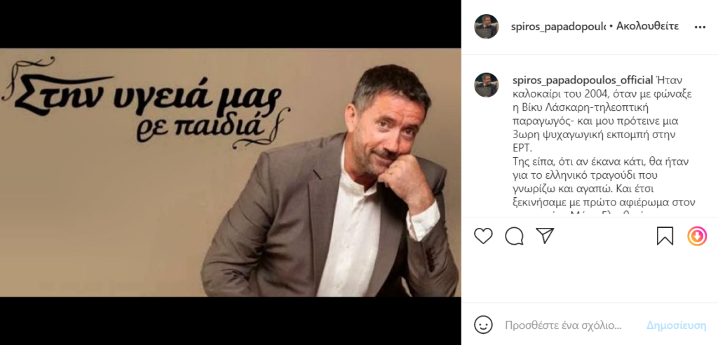 Μια ανακοίνωση μέσα από τον προσωπικό του λογαριασμό στο Instagram, έκανε ο Σπύρος Παπαδόπουλος.
