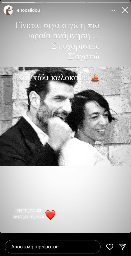 Συγκεκριμένα, δημοσίευσε μια φωτογραφία με τον Νίκο Κουρή και έγραψε: «Γίνεται σιγά σιγά η πιο ωραία ανάμνηση… Σε ευχαριστώ, σε αγαπώ. Και πάλι καλοκαίρι!».