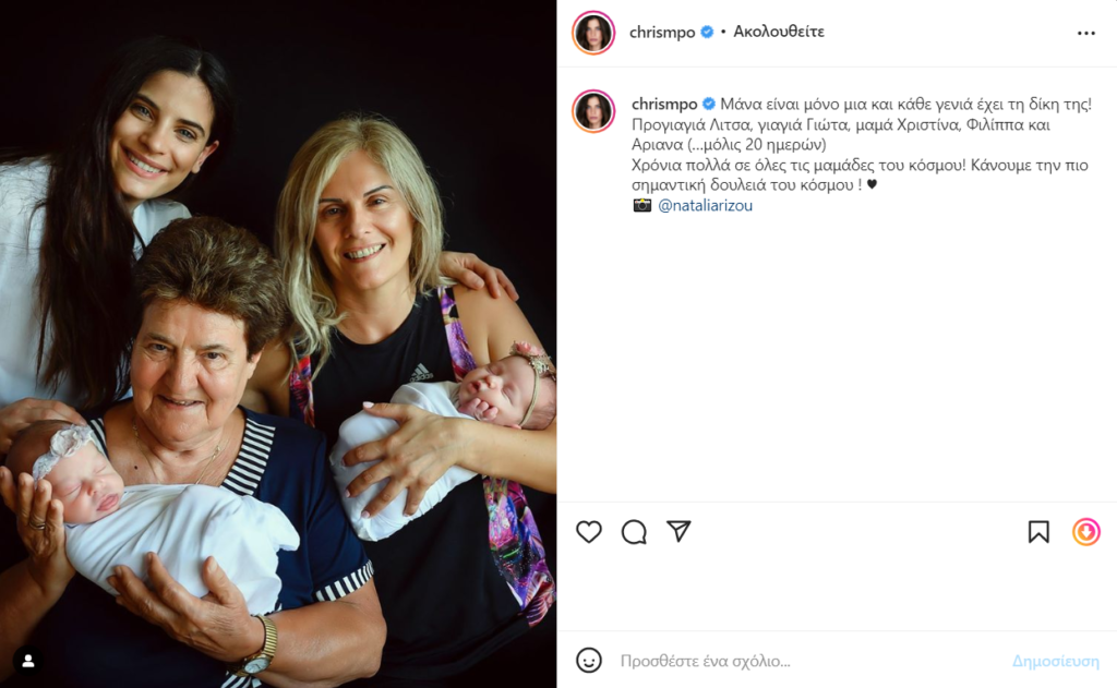 «Μάνα είναι μόνο μια και κάθε γενιά έχει τη δίκη της! Προγιαγιά Λίτσα, γιαγιά Γιώτα, μαμά Χριστίνα, Φιλίππα και Αριάνα (μόλις 20 ημερών) Χρόνια πολλά σε όλες τις μαμάδες του κόσμου! Κάνουμε την πιο σημαντική δουλειά του κόσμου!» έγραψε η Χριστίνα Μπόμπα στην ανάρτησή της.