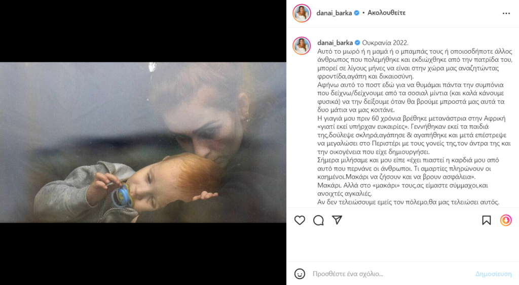 «Ουκρανία 2022. Αυτό το μωρό ή η μαμά ή ο μπαμπάς τους ή οποιοσδήποτε άλλος άνθρωπος που πολεμήθηκε και εκδιώχθηκε από την πατρίδα του, μπορεί σε λίγους μήνες να είναι στην χώρα μας αναζητώντας φροντίδα, αγάπη και δικαιοσύνη. Αφήνω αυτό το ποστ εδώ για να θυμάμαι πάντα την συμπόνια που δείχνω/δείχνουμε από τα social media (και καλά κάνουμε φυσικά) να την δείξουμε όταν θα βρούμε μπροστά μας αυτά τα δυο μάτια να μας κοιτάνε.