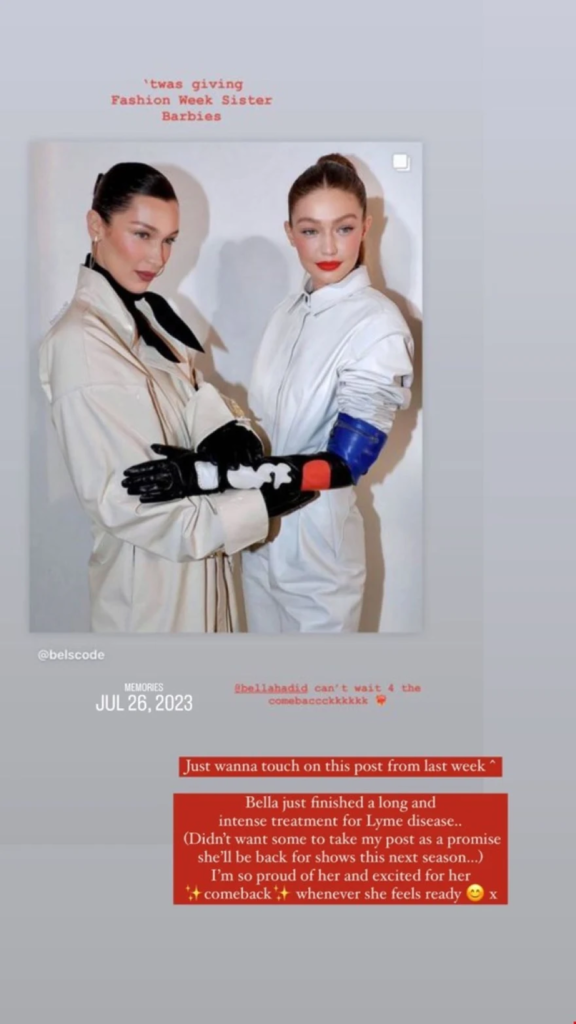 «Η Bella μόλις τελείωσε μια μακρά και έντονη θεραπεία για τη νόσο του Lyme. Δεν θα ήθελα κάποιοι να εκλάβουν την ανάρτησή μου ως υπόσχεση πως θα επιστρέψει στα σόου της επόμενης σεζόν», έγραψε η Hadid και εξήγησε: