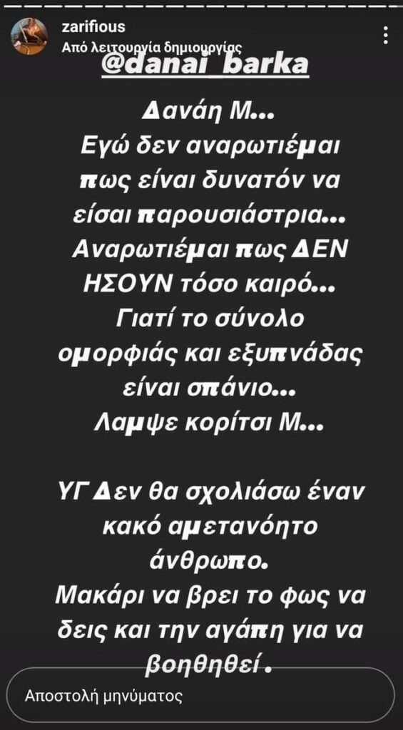 «Δανάη Μ… Εγώ δεν αναρωτιέμαι πως είναι δυνατόν να είσαι παρουσιάστρια… Αναρωτιέμαι πως ΔΕΝ ΗΣΟΥΝ τόσο καιρό… Γιατί το σύνολο ομορφιάς και εξυπνάδας είναι σπάνιο. Λάμψε κορίτσι Μ…