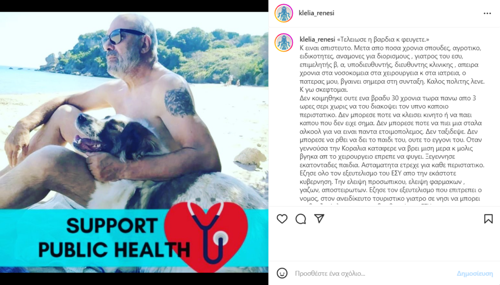 Εζησε τον εξευτελισμο που επιτρεπει ο νομος, στον ανειδίκευτο τουριστικο γιατρο σε νησι να μπορει να βγαζει 4πλασια απ τον διευθυντή του ΕΣΥ που εχει να κοιμηθει 2 μηνες για να εξυπηρετήσει την τουριστικη τορπιλη. Καλος πολιτης δεν θα ναι απο δω κ περα. Καλος πολιτης ηταν παντα. Κ μακαρι ολοι οι ανθρωποι να αντιμετωπιζαν την δουλεια τους με τοση ευλαβεια κ συνεπεια. Μπαμπα, σήμερα που θα αδειασεις το γραφειο σου κ θα παραδωσεις τα κλειδια, εισαι χορτατος στην καρδια κ δουλεψες μια ζωη με παθος. Οπως ταιριαζει στην φτιαξια σου. Κ πως αλλιως θα εβγαινε η βαρδια, χωρις φωτια στα ματια;! Φτου ξελευθερια κ αερα στα πανια σου!! Andreas Renesis” , έγραψε η Κλέλια Ρένεση στην ανάρτηση της.