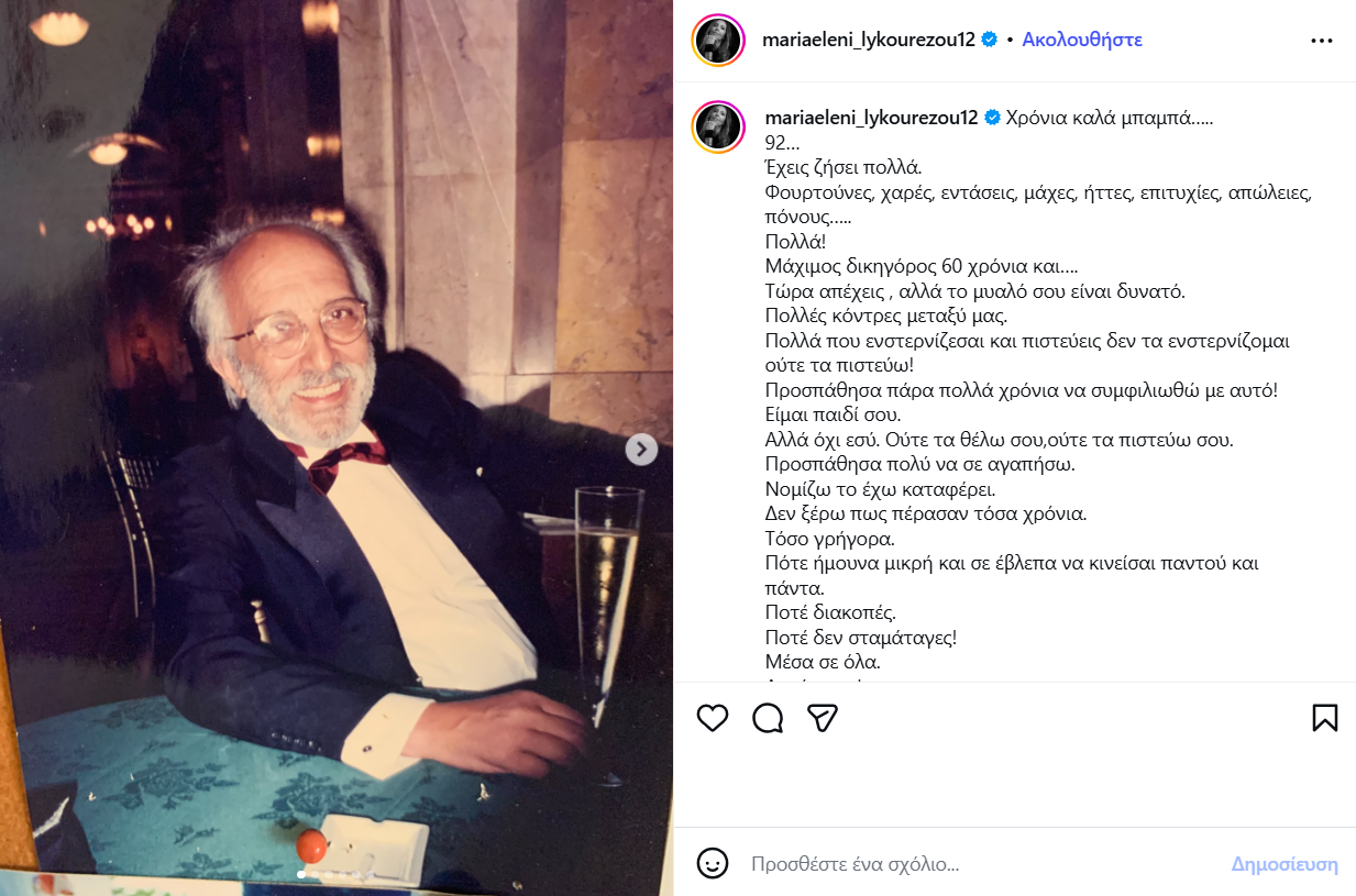 Ο ποινικολόγος γίνεται 92 ετών και η κόρη του, Μαρία Ελένη Λυκουρέζου θέλησε να του ευχηθεί και δημόσια με μια τρυφερή ανάρτηση που έκανε στο προσωπικό της προφίλ στο Instagram.
