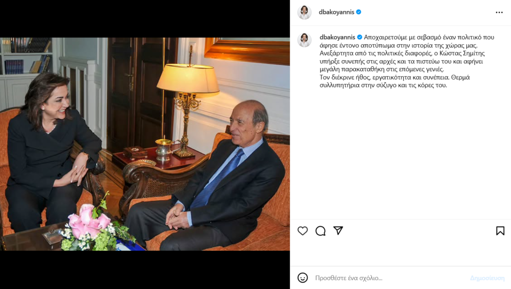 «Αποχαιρετούμε με σεβασμό έναν πολιτικό που άφησε έντονο αποτύπωμα στην ιστορία της χώρας μας. Ανεξάρτητα από τις πολιτικές διαφορές, ο Κώστας Σημίτης υπήρξε συνεπής στις αρχές και τα πιστεύω του και αφήνει μεγάλη παρακαταθήκη στις επόμενες γενιές. Τον διέκρινε ήθος, εργατικότητα και συνέπεια. Θερμά συλλυπητήρια στην σύζυγο και τις κόρες του. Ένας μεγάλος Έλληνας που έβαλε το καλό της χώρας πάνω από το λαϊκισμό της εποχής έχοντας το μισό ΠΑΣΟΚ απέναντι του. Ελλάς ευνομονούσα», έγραψε η Ντόρα Μπακογιάννη την ανάρτηση της.