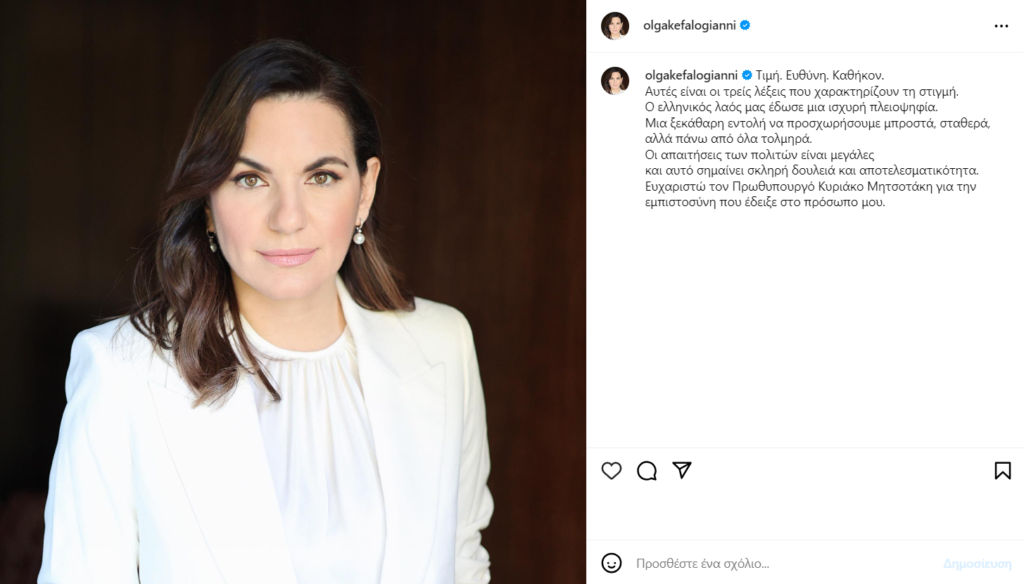 Οι απαιτήσεις των πολιτών είναι μεγάλες και αυτό σημαίνει σκληρή δουλειά και αποτελεσματικότητα. Ευχαριστώ τον Πρωθυπουργό Κυριάκο Μητσοτάκη για την εμπιστοσύνη που έδειξε στο πρόσωπο μου», έγραψε η Όλγα Κεφαλογιάννη στη λεζάντα του post της.