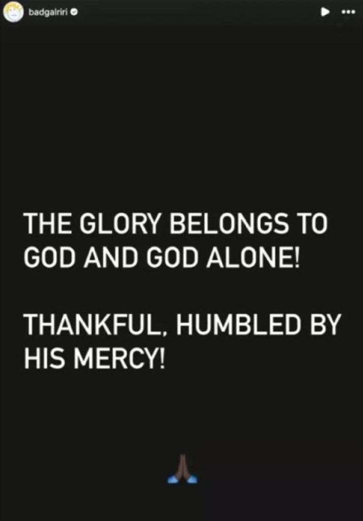 Συγκεκριμένα η 36χρονη τραγουδίστρια λίγες ώρες μετά, έσπασε την σιωπή της μέσω social media και έγραψε: «Η δόξα ανήκει στον Θεό και μόνο σε αυτόν», προσθέτοντας: «Είμαι ευγνώμων, ταπεινωμένη από το έλεός του!»