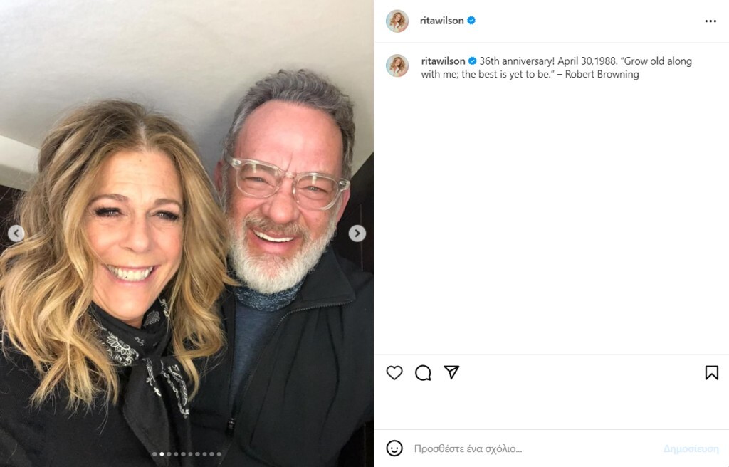 «36η επέτειος! 30 Απριλίου 1988. “Γέρασε μαζί μου, τα καλύτερα δεν έχουν έρθει ακόμα” – Ρόμπερτ Μπράουνινγκ» έγραψε η Rita Wilson στη λεζάντα της ανάρτησής της.
