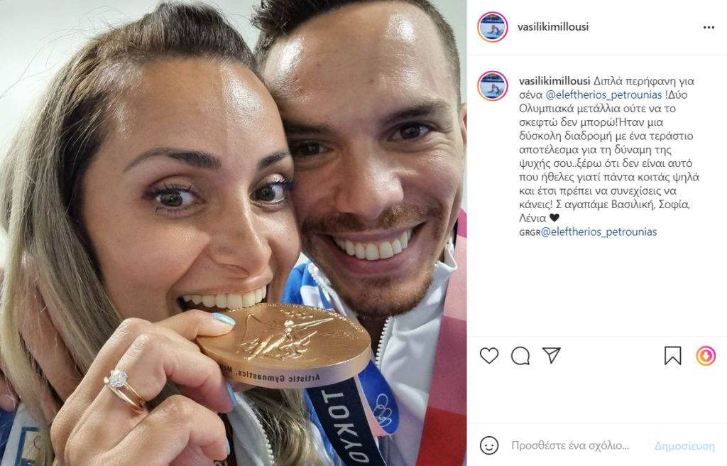 Ενώ λίγη ώρα μετά την απονομή του, η σύζυγος του Έλληνα πρωταθλητή Βασιλική Μιλλούση που είναι ιδιαίτερα ενεργή στα social media, έκανε την πρώτη της ανάρτηση στο Instagram και δήλωσε διπλά περήφανη.