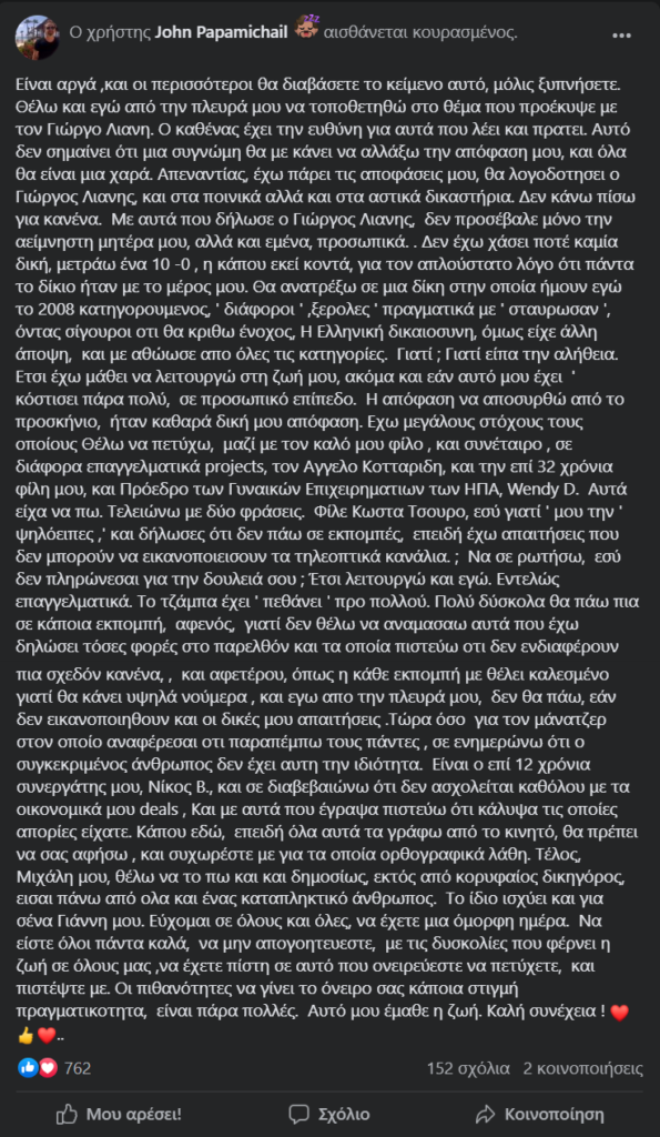 Μια ανάρτηση στον προσωπικό του λογαριασμό στο Facebook, έκανε ο Γιάννης Παπαμιχαήλ και απάντησε για την απόφασή του να κινηθεί νομικά κατά του Γιώργου Λιάνη μετά τις δηλώσεις του για την Αλίκη Βουγιουκλάκη.